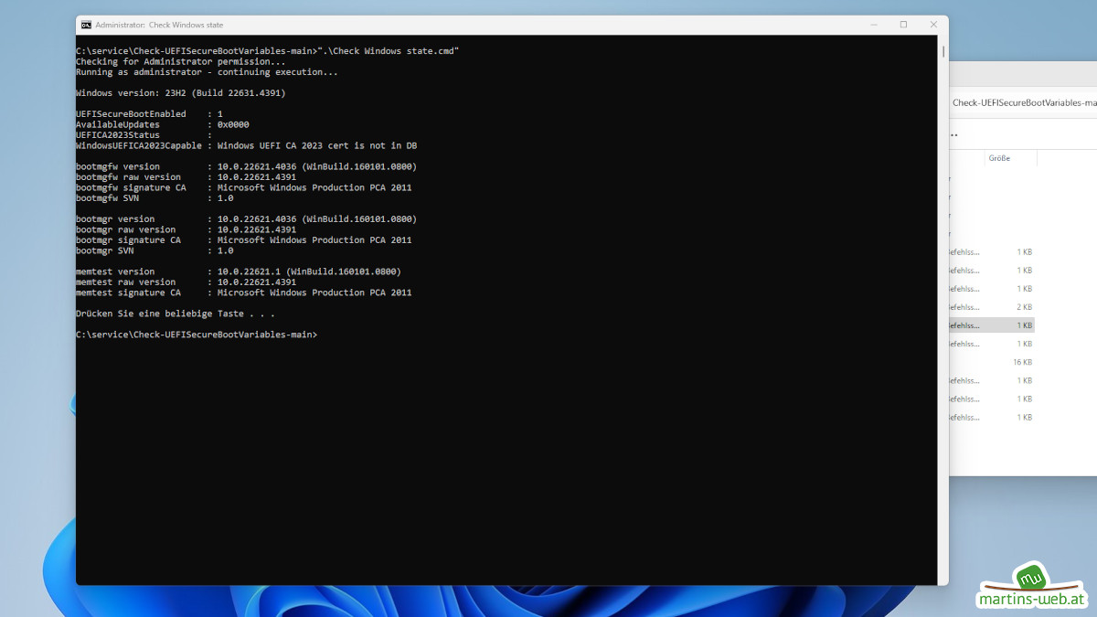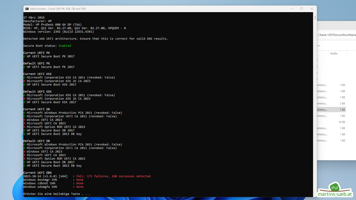 Diese sind zum Überprüfen, ob die Zertifikate schon auf dem Rechner vorhanden sind. Ob sich diese bereits in den Windows SecureBoot Datenbanken befinden und ob diese auch im BIOS bzw. UEFI vorhanden sind. Die Skripte sind, wie anzunehmen als Administrator auszuführen.