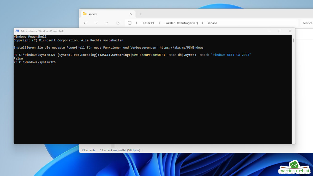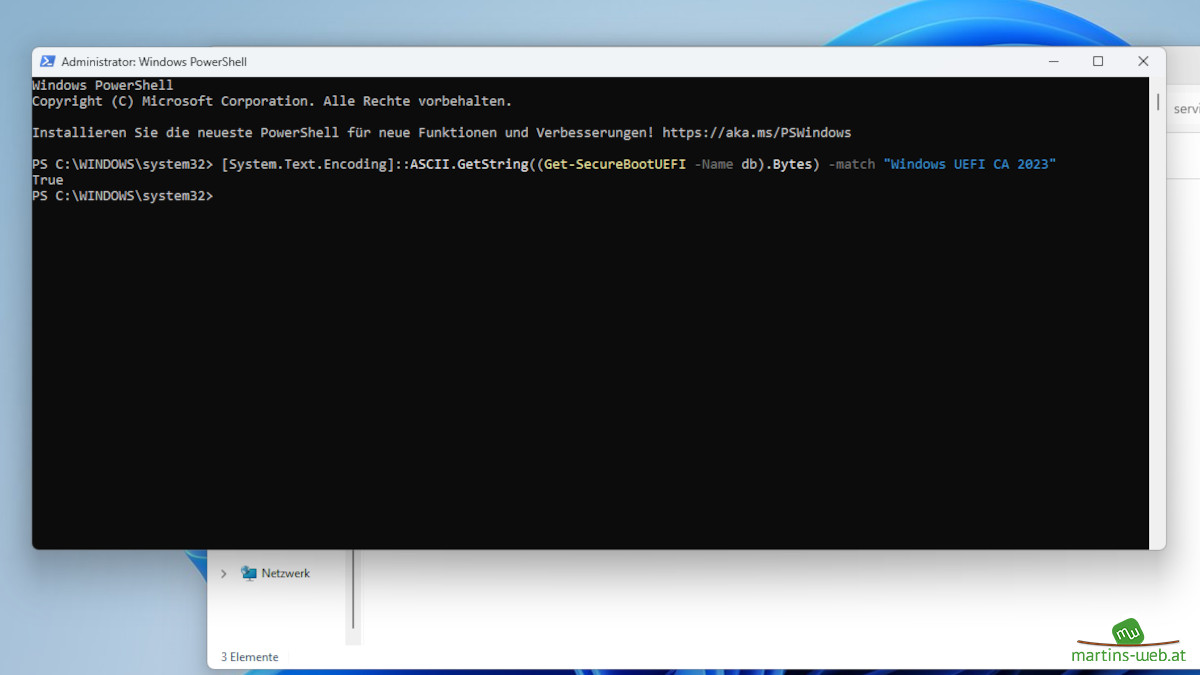 Zusätzlich wird noch folgende Powershell-Zeile benötigt (ebenfalls als Administrator ausführen) um den Zertifikatsnamen in der SecureBoot-DB auszulesen.