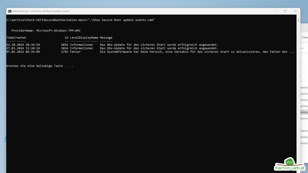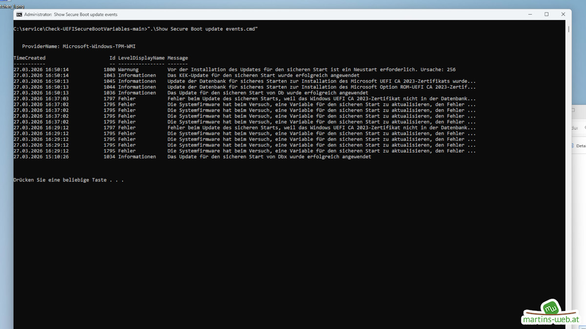 Warten würde bei meinem TV-Rechner ohne Internetverbindung auch nichts bringen. Mit dem Ausführen der „Apply 2023 KEK, DB and bootmgfw update.cmd“ und „Apply DBX update.cmd“ wird das Einspielen der Zertifikate forciert. Nach dem Ausführen sollte man ca. 15min warten.
