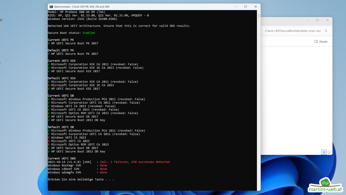 Der erneute Check mit der “Check UEFI PK KEK DB and DBX.cmd” zeigt jetzt folgendes Ergebnis.